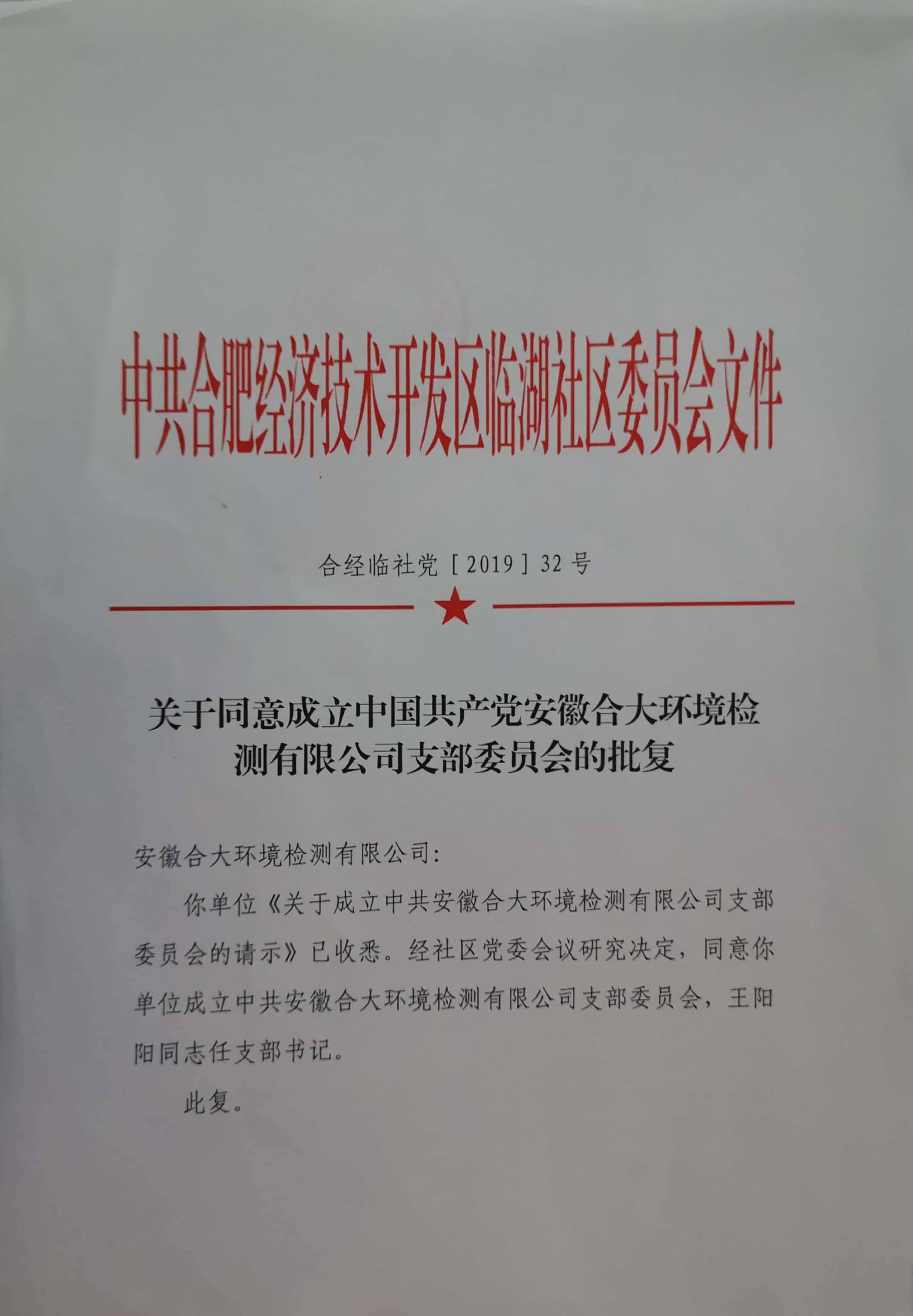 2019年6月12日,中國共產(chǎn)黨安徽合大環(huán)境檢測有限公司支部委員會成立儀式在安徽合大環(huán)境檢測有限公司多功能會議室隆重舉行!