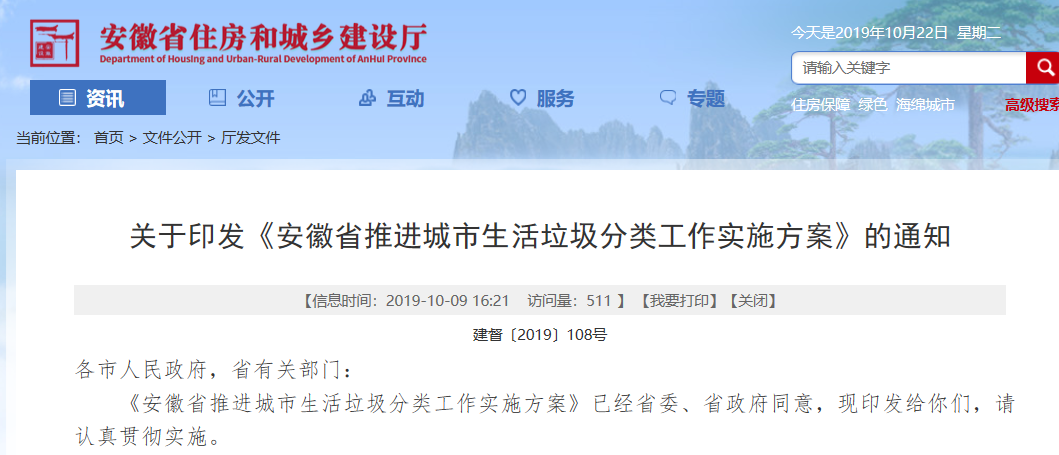 2019年安徽省住房和城鄉(xiāng)建設(shè)廳印發(fā)《安徽省推進(jìn)城市生活垃圾分類工作實施方案》,要求到2020年,合肥市、銅陵市基本建成生活垃圾分類處理系統(tǒng);其他設(shè)區(qū)的市實現(xiàn)公共機(jī)構(gòu)生活垃圾強(qiáng)制分類全覆蓋,每個區(qū)至少有一個街道基本建成生活垃圾分類示范片區(qū);到2022年,各設(shè)區(qū)的市至少有一個區(qū)實現(xiàn)生活垃圾分類全覆蓋;到2025年,所有設(shè)區(qū)的市基本建成生活垃圾分類處理系統(tǒng)。
