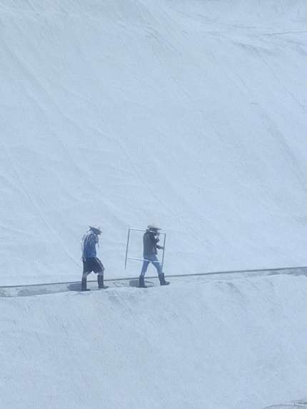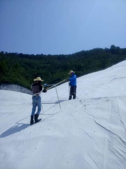 夏天的天,嬰孩的臉-----說變就變。剛才還是風雨交加,現(xiàn)在又是陽光燦爛。似火的驕陽,讓檢測人員瞬間體會到什么是酷暑難耐;再加上膜的反射威力讓他們頭暈目眩、大汗淋漓······不僅如此,有的邊坡還極其陡峭:海拔落差達130米左右。在這工作的員工,勝似在懸崖峭壁上攀巖。但隊友們面對一個個困難,大有兵來將擋水來土掩之勢,他們憑借頑強的毅力和非凡的意志,歷經(jīng)近四天的艱苦工作,終于圓滿完成了這次膜檢測任務(wù)??吹剿麄兊膭趧映晒@些鐵漢子們也會心笑了。